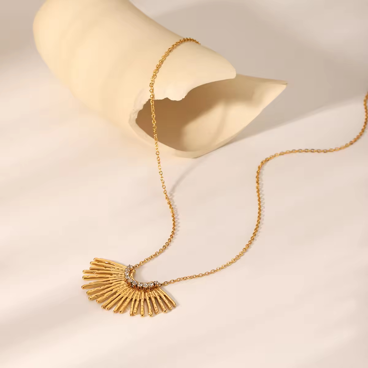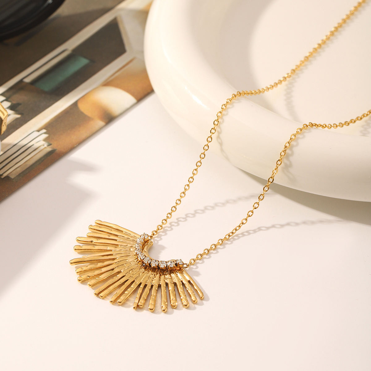 • Fashion Plated Stainless Steel Zircon Fan-Shaped Pendant Necklace Waterproof Design Geometric Sunburst Necklace Women