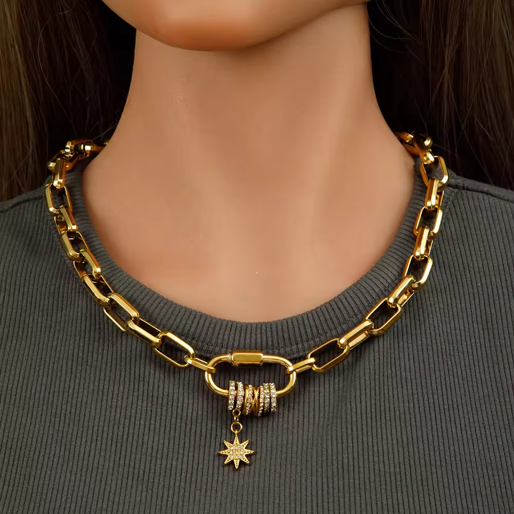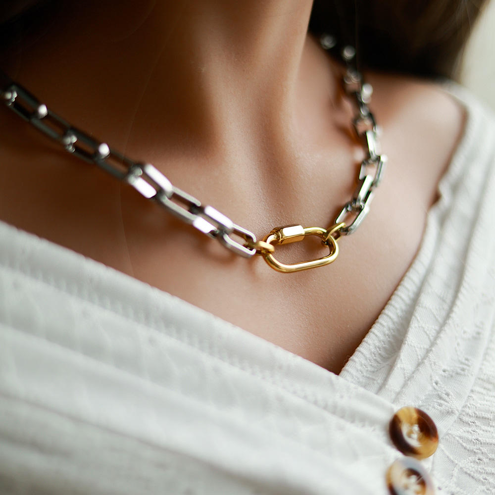 • Waterproof Jewelry Plated Chunky Chain Carabiner Necklace Stainless Steel Pave Charismatic Charm Necklace